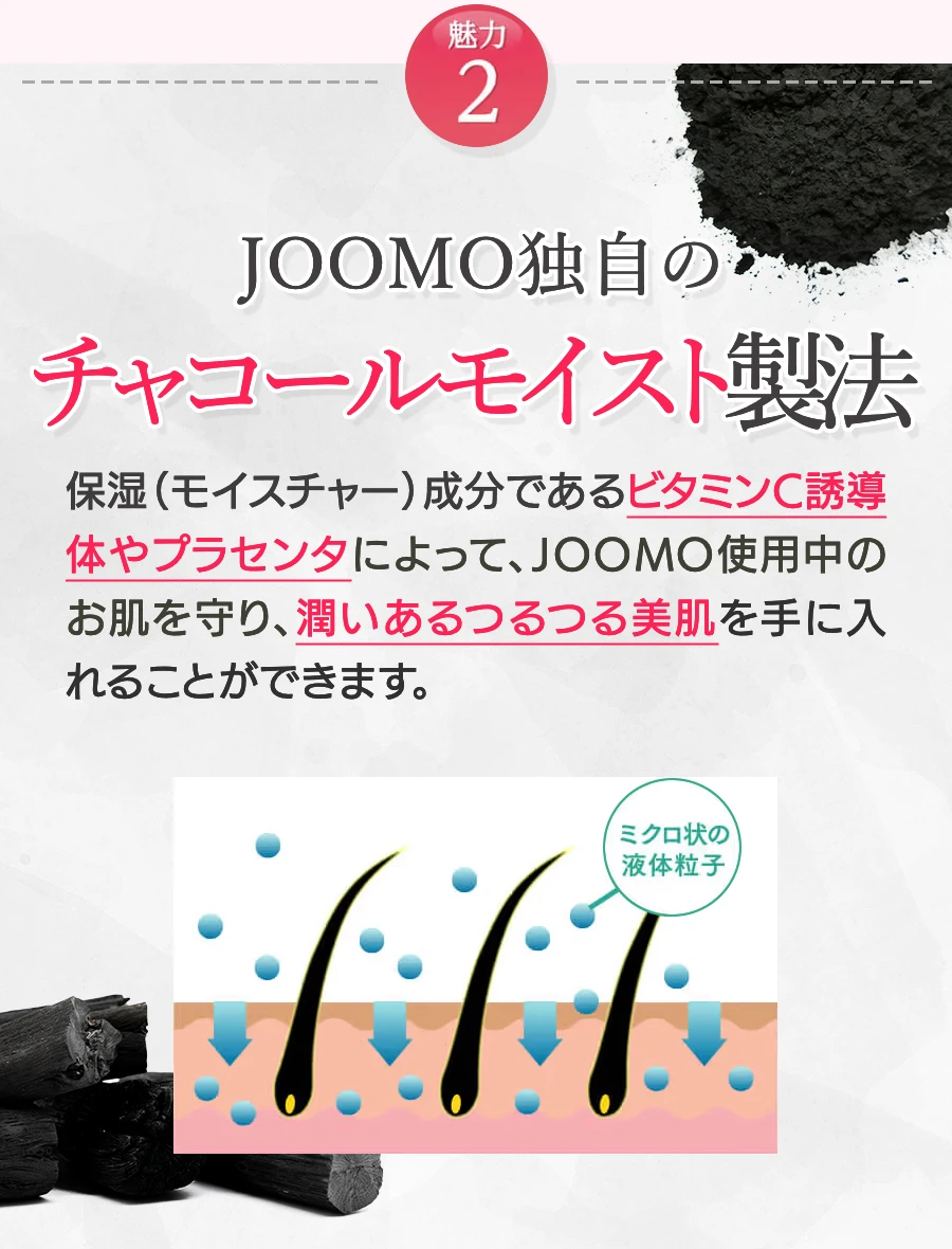 JooMO独自の「チャコールモイスト製法」で、保湿成分のビタミンC誘導体やプラセンタでお肌をしっかり守ります。