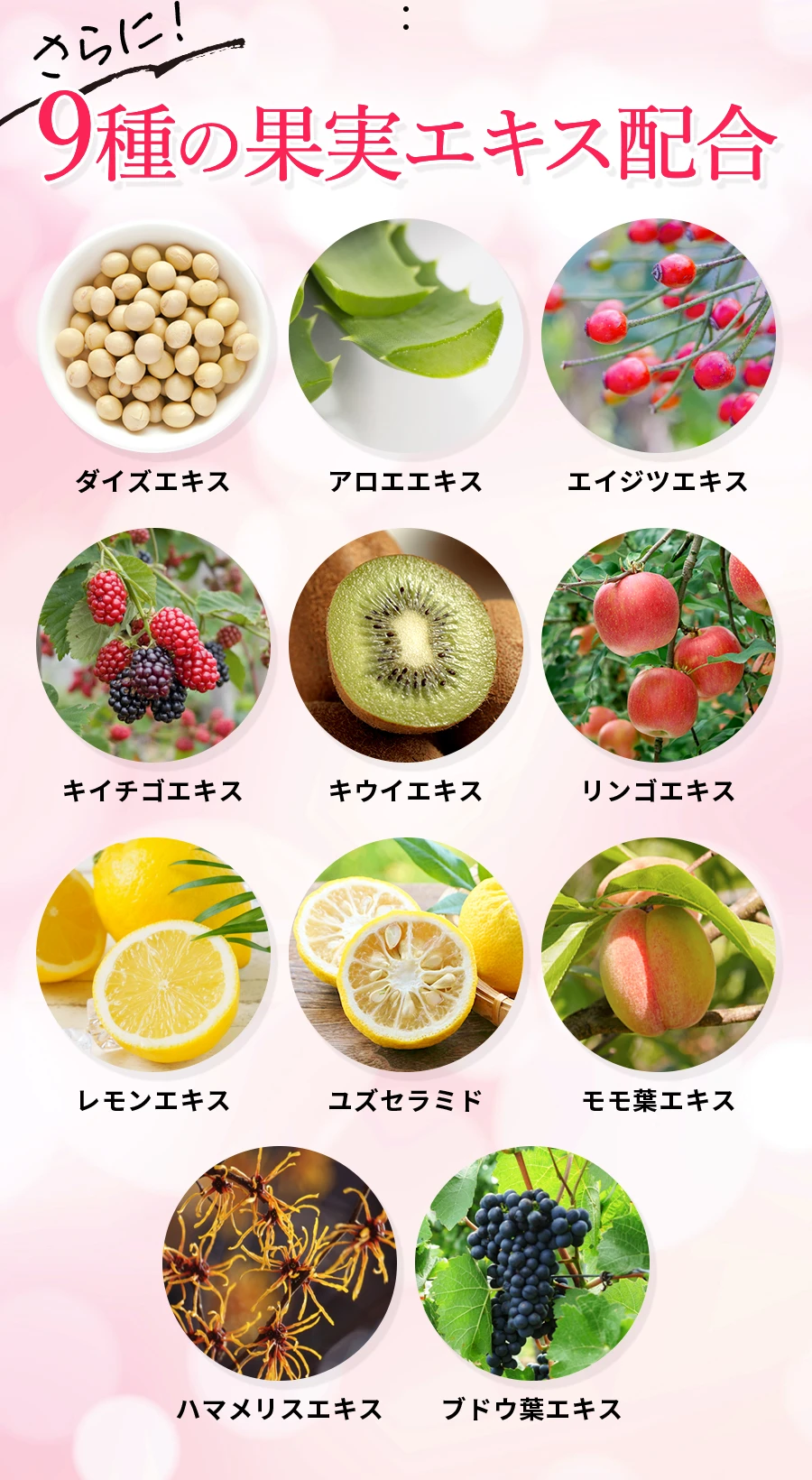 | 保湿・整肌成分 | アロエエキス、キイチゴエキス、モモ葉エキス、ハマメリスエキス、プラセンタ、ビタミンC誘導体など |