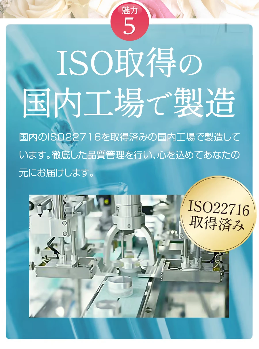 国内のISO22716を取得済みの国内工場で製造しています。徹底した品質管理を行い、心を込めてあなたの元にお届けします。